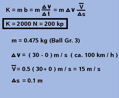 Bei einem harten Aufprall deformiert sich ein Handball fast um die Hälfte seines Durchmessers. Das sind ca. 10 cm bei der Ballgröße 3. Auf dieser kurzen Strecke erfolgt die gesamte Abbremsung des Balles im Extremfall von ca. 100 auf 0 km / h. Die dabei übertragene Bremskraft K beträgt satte 200 kp.