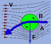 Blick von oben. Rotiert der Ball zusätzlich um die eigene Achse (wie beim Trickwurf), bildet sich im Bereich von F ein asymmetrisches Druckminimum aus, da nur hier Anströmung und Rotationsrichtung optimal übereinstimmen. Als Resultat beschreibt der Ball eine nach links gekrümmte Flugbahn. Dieser sog. Magnus-Effekt wird unterstützt durch den schwächeren turbulenten Strömungsabriss bei A im Vergleich zu B.