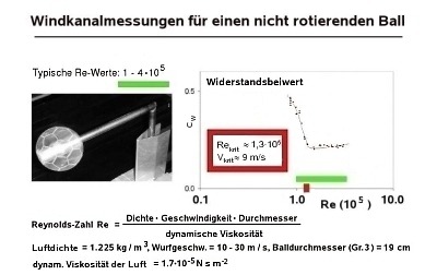 Der Turbulenzzustand der Umströmung wird durch die sog. Reynolds-Zahl beschrieben, in die als wesentliche Kenngröße die Wurfgeschwindigkeit im Verhältnis zur Zähigkeit der Luft eingeht. Bei gängigen Handbällen wird ab 9 m/s der Reynolds-Zahlen-Bereich mit den hohen Widerstandsbeiwerten verlassen und die Aerodynamik verbessert sich (wie oben beschrieben) im sog. kritischen Bereich (positiv gemeint !) sprunghaft.