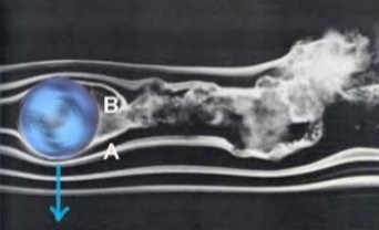 Entscheidend ist dabei, dass im Bereich von A die schnellere Strömung der Balloberfläche deutlich länger folgen kann (Coanda-Effekt), während sie bei B durch die Scherung zwischen Rotation und Anströmung frühzeitig abreißt und verwirbelt.