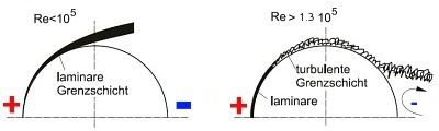 Bei super schnellen Bällen (über 100 km/h) mit rauher Oberfläche nimmt dann allerdings der Widerstandsbeiwert wieder zu (überkritischer und transkritischer Bereich). Hier (aber wirklich auch erst hier !) erreichen Bälle mit glatter Oberfläche Spitzenwerte um 0.1 .