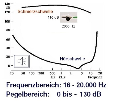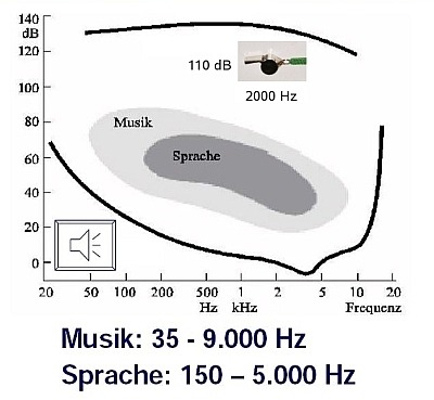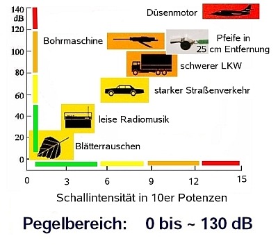 Eine "harmlose" Trillerpfeife (in 25 cm Entfernung kräftig geblasen) liegt mit 110 dB nur knapp unter dem Schmerz-, aber bereits voll im Schädigungs- bereich für das menschliche Ohr.