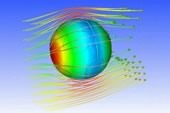 Animation der Luftströmung um einen Ball eingefärbt nach der Geschwindigkeit. Auf der Balloberfläche sind die Druckkonturen abgebildet: rot = hoher Druck, blau = niedriger Druck.